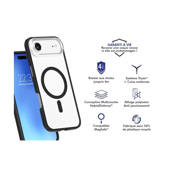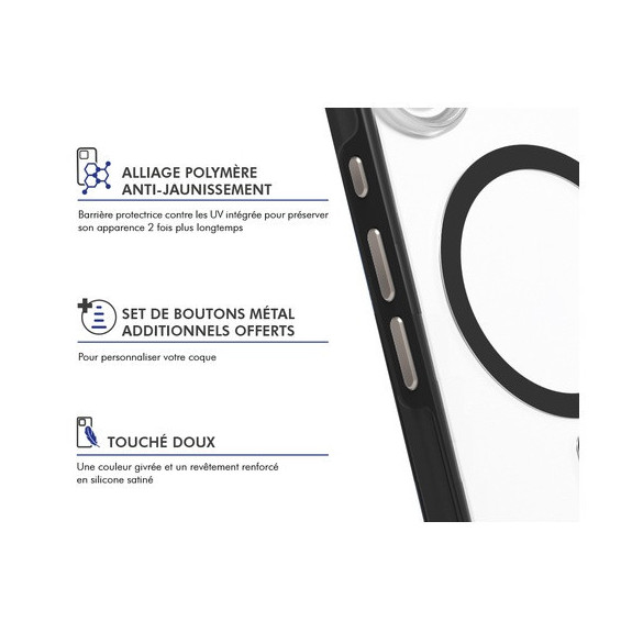 Les bords surélevés protègent efficacement l’écran et la caméra, tandis que son système aimanté renforcé est 100% compatible Magnet & MagSafe pour une charge rapide et stable. Son revêtement mat anti-traces, ses boutons métalliques interchangeables et son traitement anti-jaunissement garantissent élégance et durabilité. Éco-conçue avec 50% de plastique recyclé et couverte par une garantie à vie, cette coque allie protection, design et responsabilité.