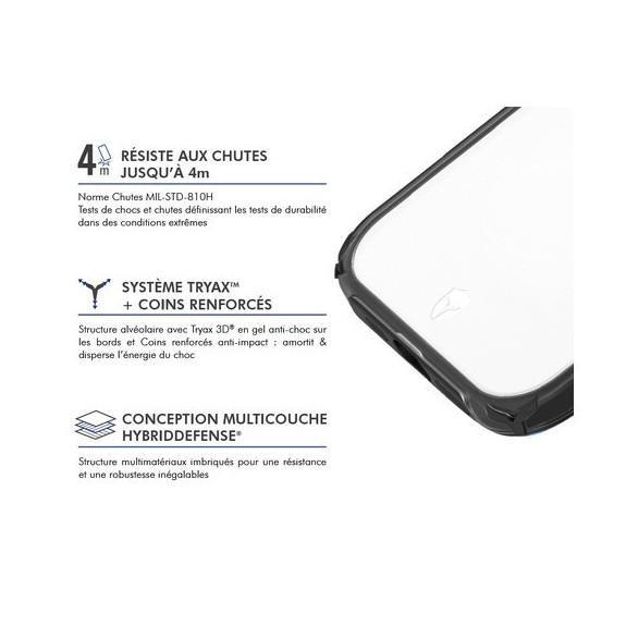 - Protection en cas de chute : Angles renforcés conçus pour une absorption optimale des chocs, Bords surélevés pour éviter les impacts et les rayures, Jusqu'à 4 m, Protection contour caméra