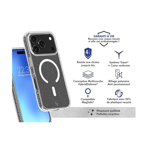 Garantie à vie ! Découvrez la coque renforcée Air Xtrem MagSafe Pailettes de Force Case, conçue pour résister aux chocs et aux chutes jusqu’à 4 mètres grâce à sa certification militaire MIL-STD-810G. Son double système de protection, associant Tryax3D® et coins renforcés, assure une sécurité totale contre les impacts.