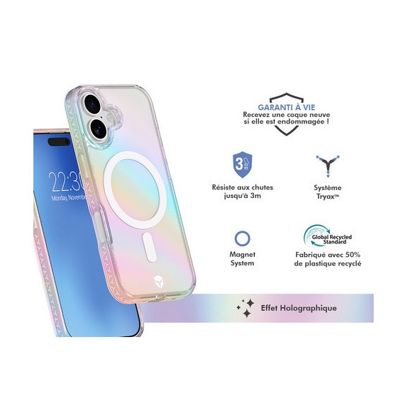 Garantie à vie ! Résistante aux chutes de 3m, la coque Renforcée Air MagSafe Holo de Force Case combine finesse et robustesse grâce à ses technologies exclusives Air Cushion et Tryax. Ses aimants renforcés assurent une fixation optimale sur les accessoires MagSafe.