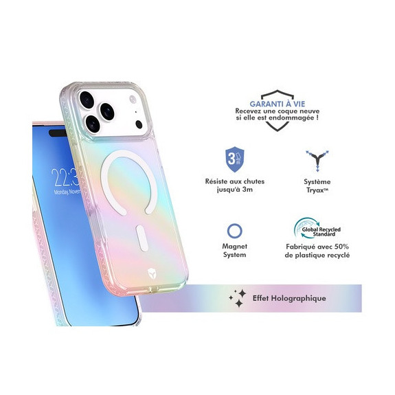 Garantie à vie ! Résistante aux chutes de 3m, la coque Renforcée Air MagSafe Holo de Force Case combine finesse et robustesse grâce à ses technologies exclusives Air Cushion et Tryax. Ses aimants renforcés assurent une fixation optimale sur les accessoires MagSafe.